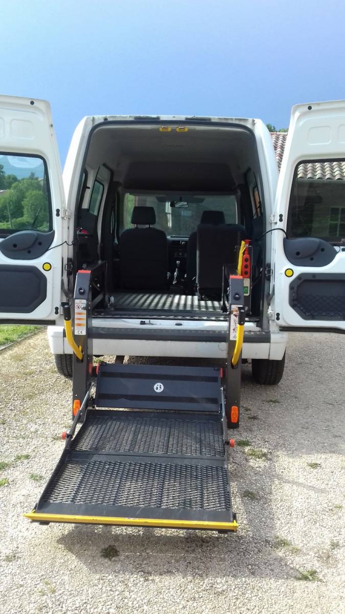 Le véhicule est aménagé pour 1 fauteuil roulant et équipé s'un hayon hydraulique à l'arrière