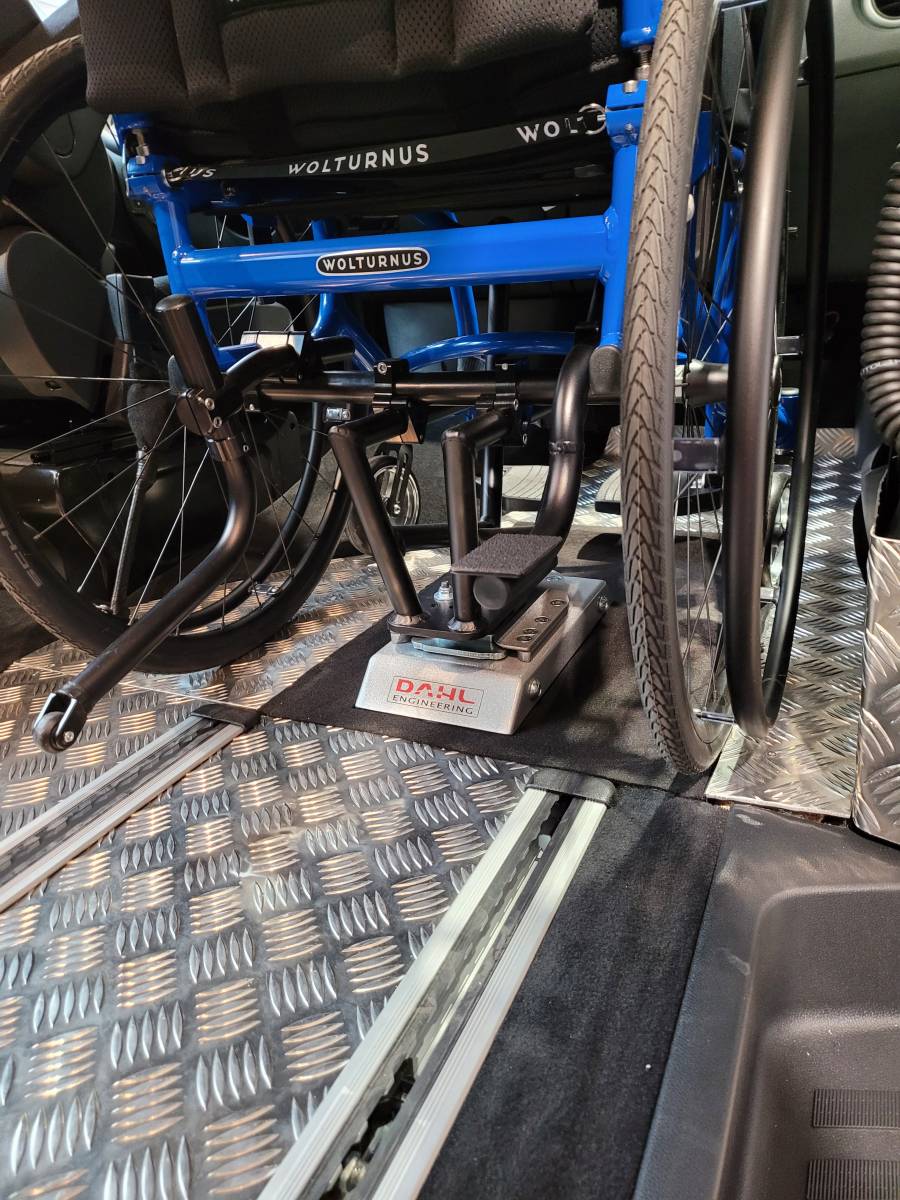 Le système de retenue ce fera a l'aide d'une embase DAHL qui verrouille votre fauteuil électrique ou manuel automatiquement, fini la contrainte des sangles à manipuler.