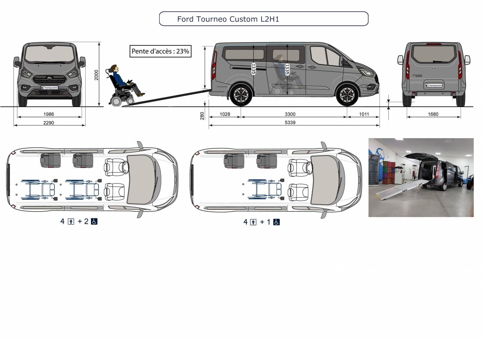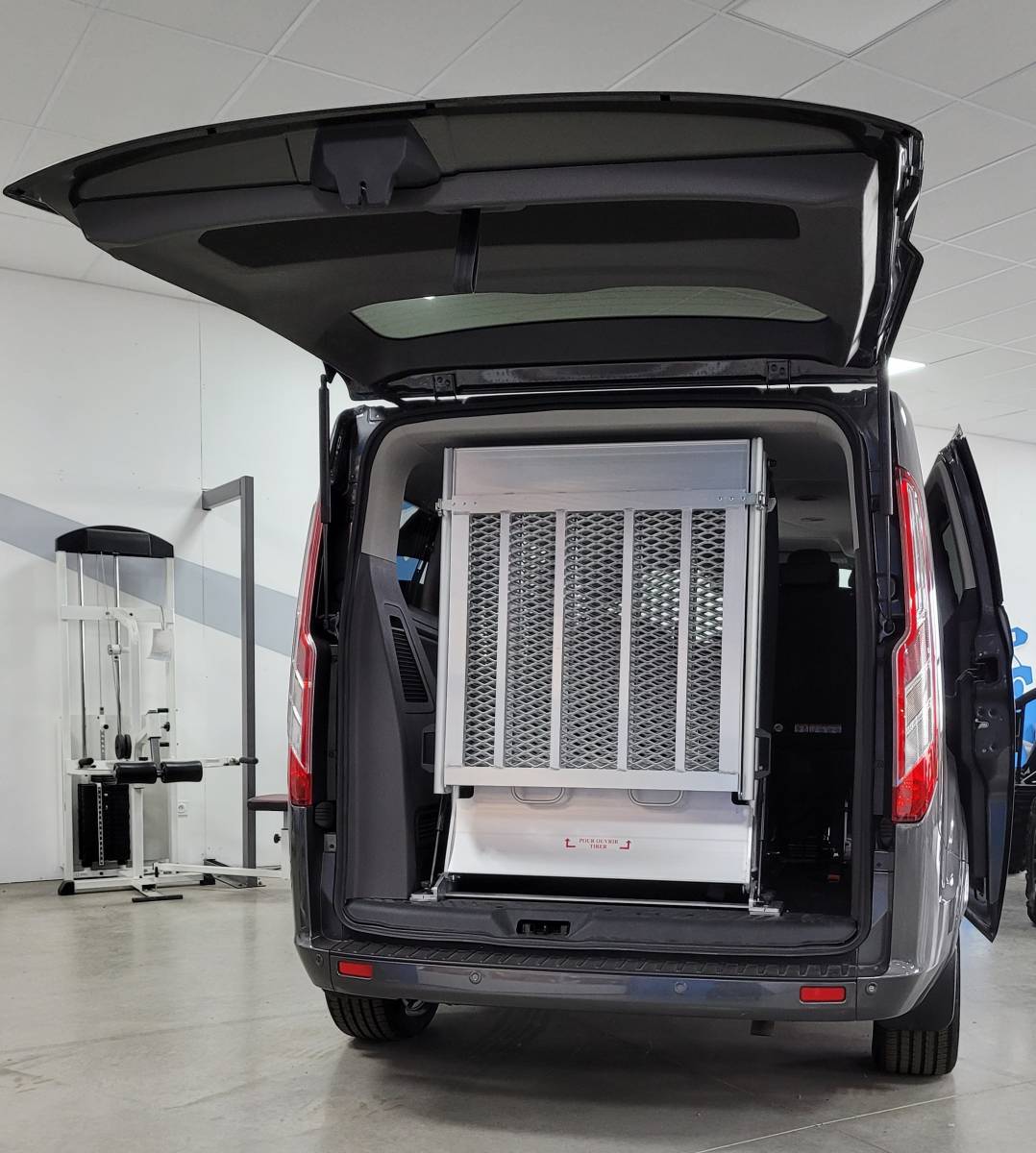 la Société Handi Drive spécialiste dans l'aménagement de véhicule pour personnes handicapées, située à Saint Cyr dans l'Ardèche proche de Lyon et Valence vous propose une solution d'aménagement de véhicule sur un Ford Tourneo Custom L2H1 TPMR avec une rampe d'accès en 3 volets.