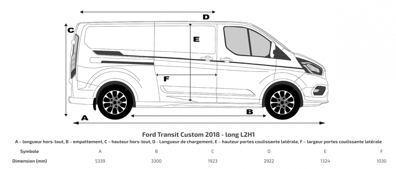 A – longueur hors-tout, B – empattement, C – hauteur hors-tout, D - Longueur de chargement, E – hauteur portes coulissante latérale, F – largeur portes coulissante latérale