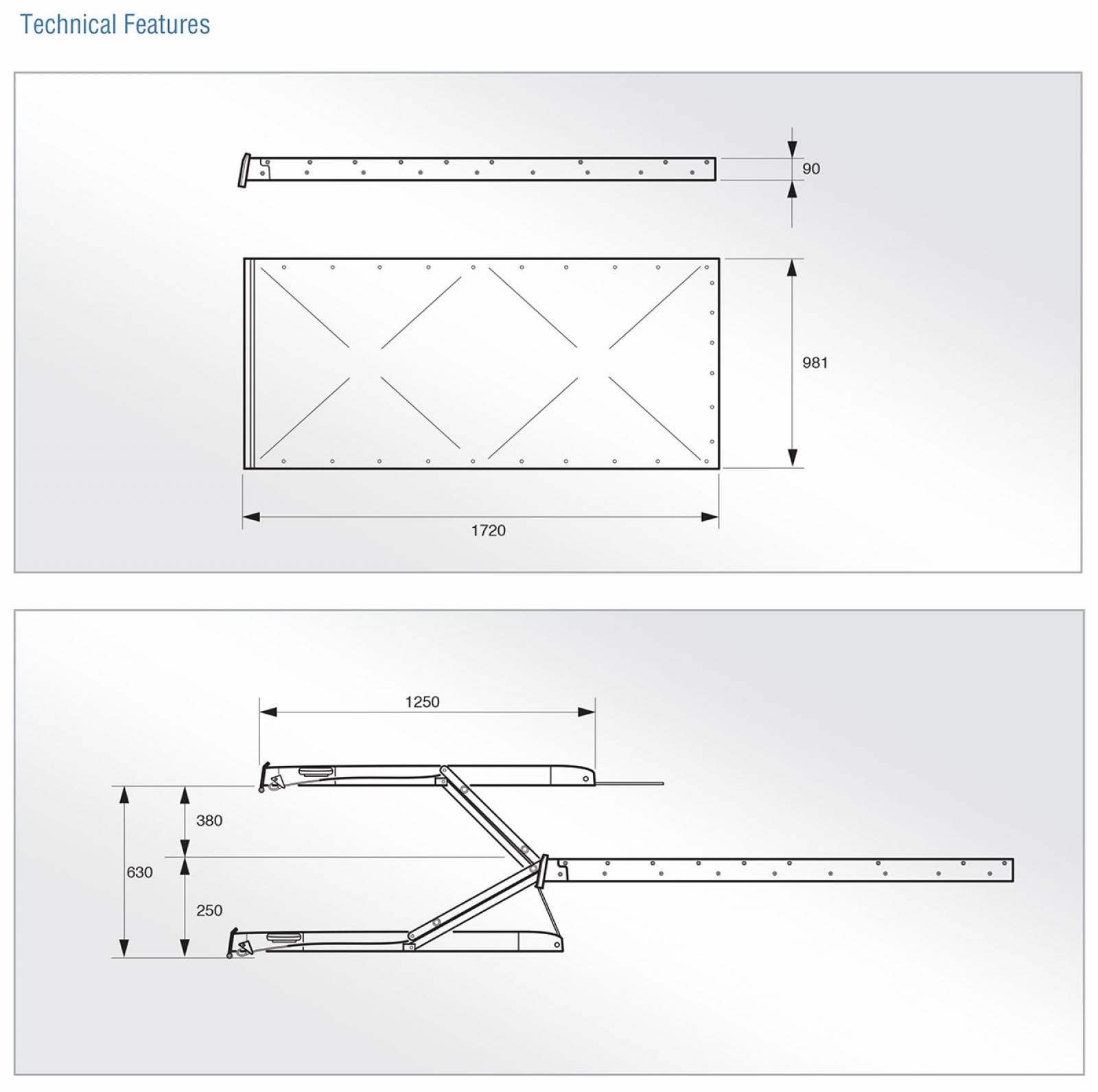 Ce type de hayon F900 sous plancher est entièrement automatique avec tiroir de protection étanche à l'eau hauteur 9cm, une plate forme en aluminium avec surface antidérapante, une pompe hydraulique et une dimension de plate-forme 800 X 1250.